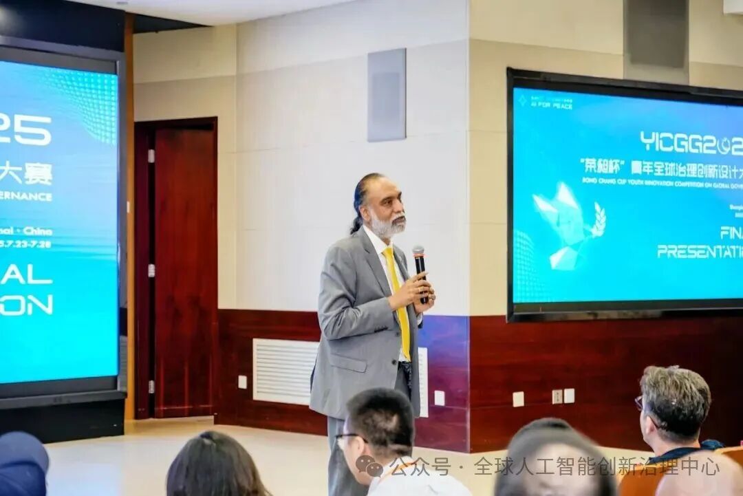 在光华楼志和堂,吉尔一行观摩了“荣昶杯”青年全球治理创新设计大赛(YICGG2025)“AI for Peace”决赛答辩,吉尔对学生提出的人工智能促进和平与安全的创新方案给予高度评价。